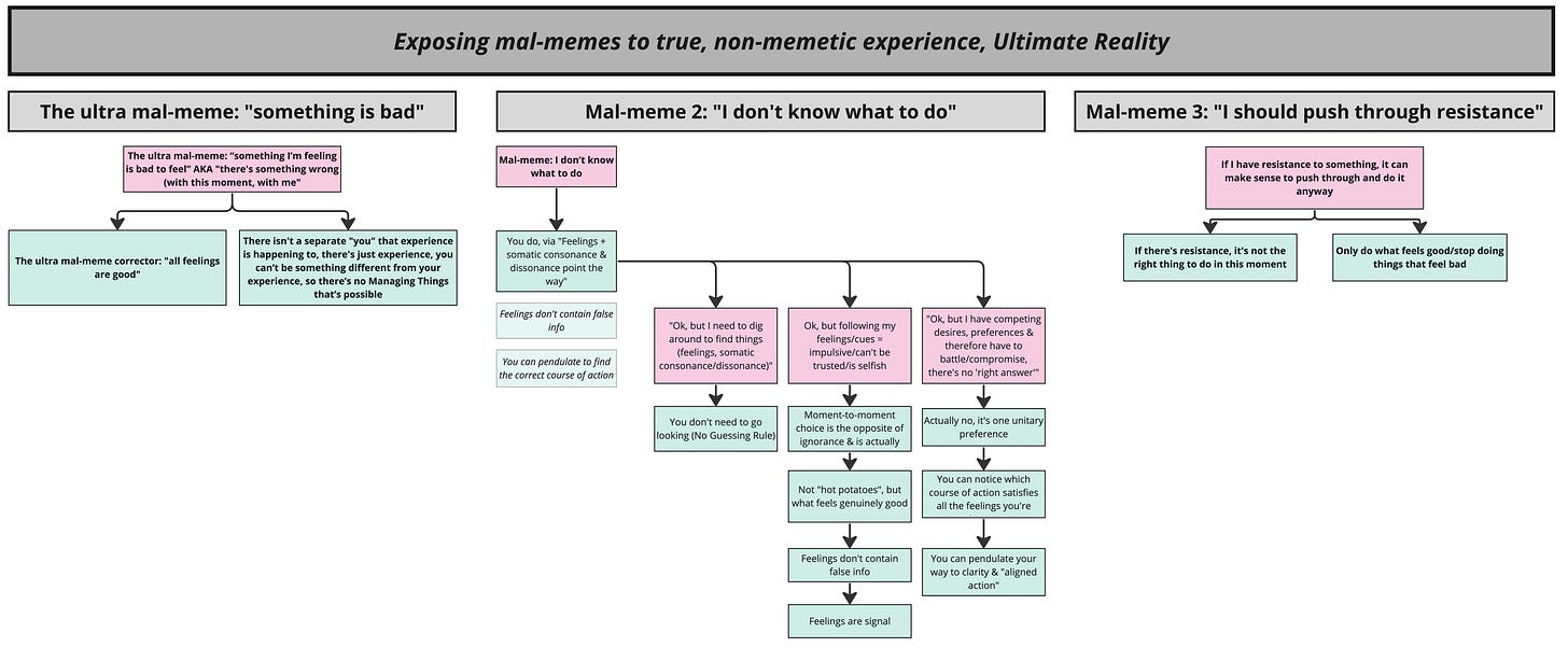 I’ll call them mal-memes for lack of a better word, because they’re easy to think and spread, and they seem to be the exact thing at the root of our problem. When we take them on, or generate them ourselves, and act on them, we end up doing all sorts of things based on no real want whatsoever. But when we look at them closely, we see the nearby actual thoughts/feelings/preferences that they’re approximating, and the fake thing drops away. From there, we pretty naturally just do the things we actually have consensus to do.